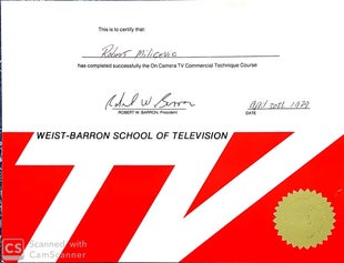 My Certificate from New Yorks Weist Barron School of Television for doing Acting and Voice Acting in 1979.